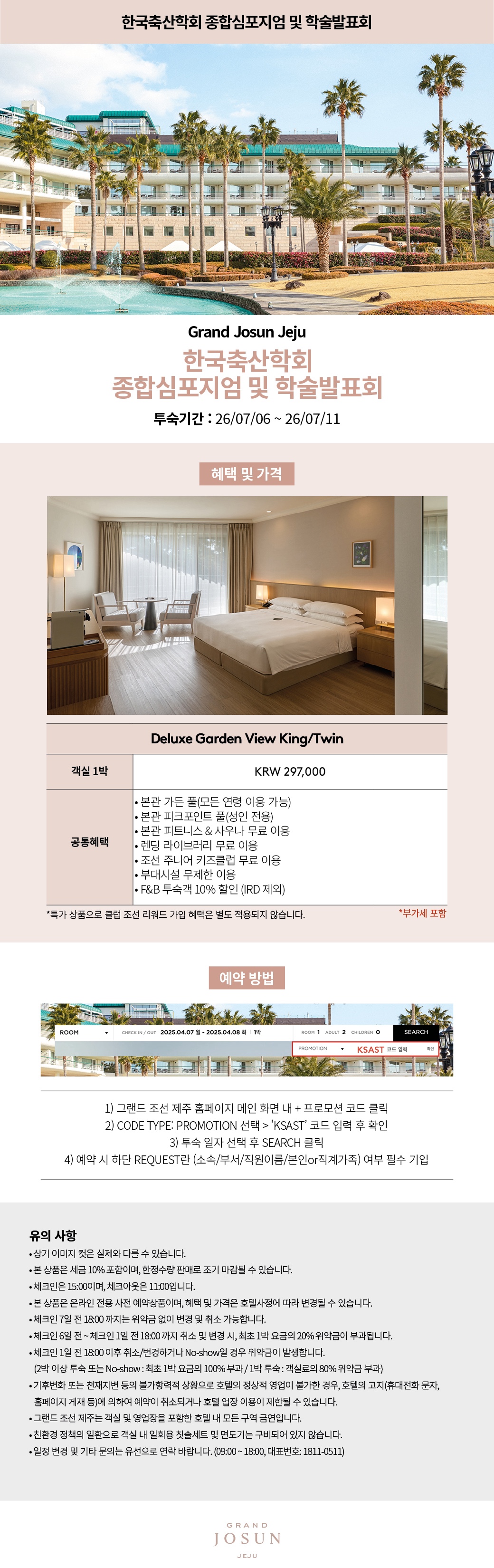 제주부영호텔&리조트 주소 : 서귀포시 중문관광로 222(중무동2700-2) 홈페이지 : http://www.booyoungjejuhotel.com 예약방법 : 홈페이지 접속 ▶ https://www.booyoungjejuhotel.com/view/index.do →호텔/리조트 예약 →기업체 코드 조회 란에 '2026KSAST' 입력후 예약 (~4/30) |